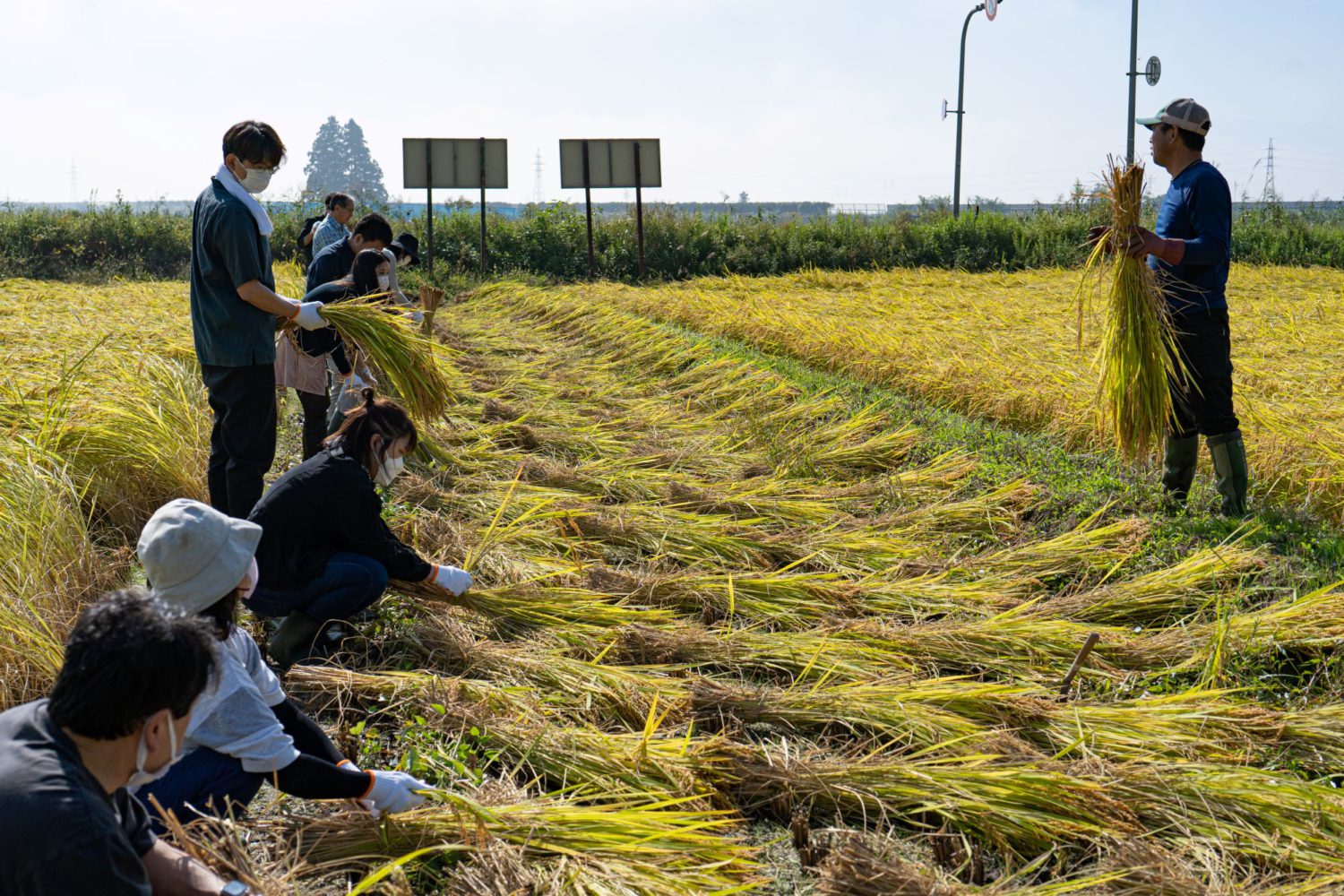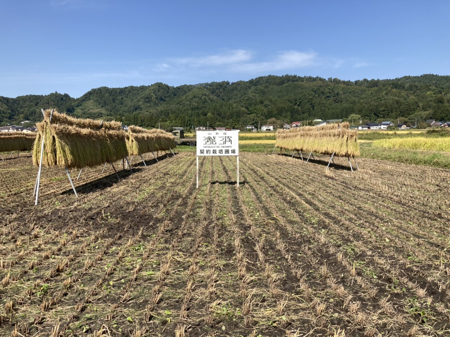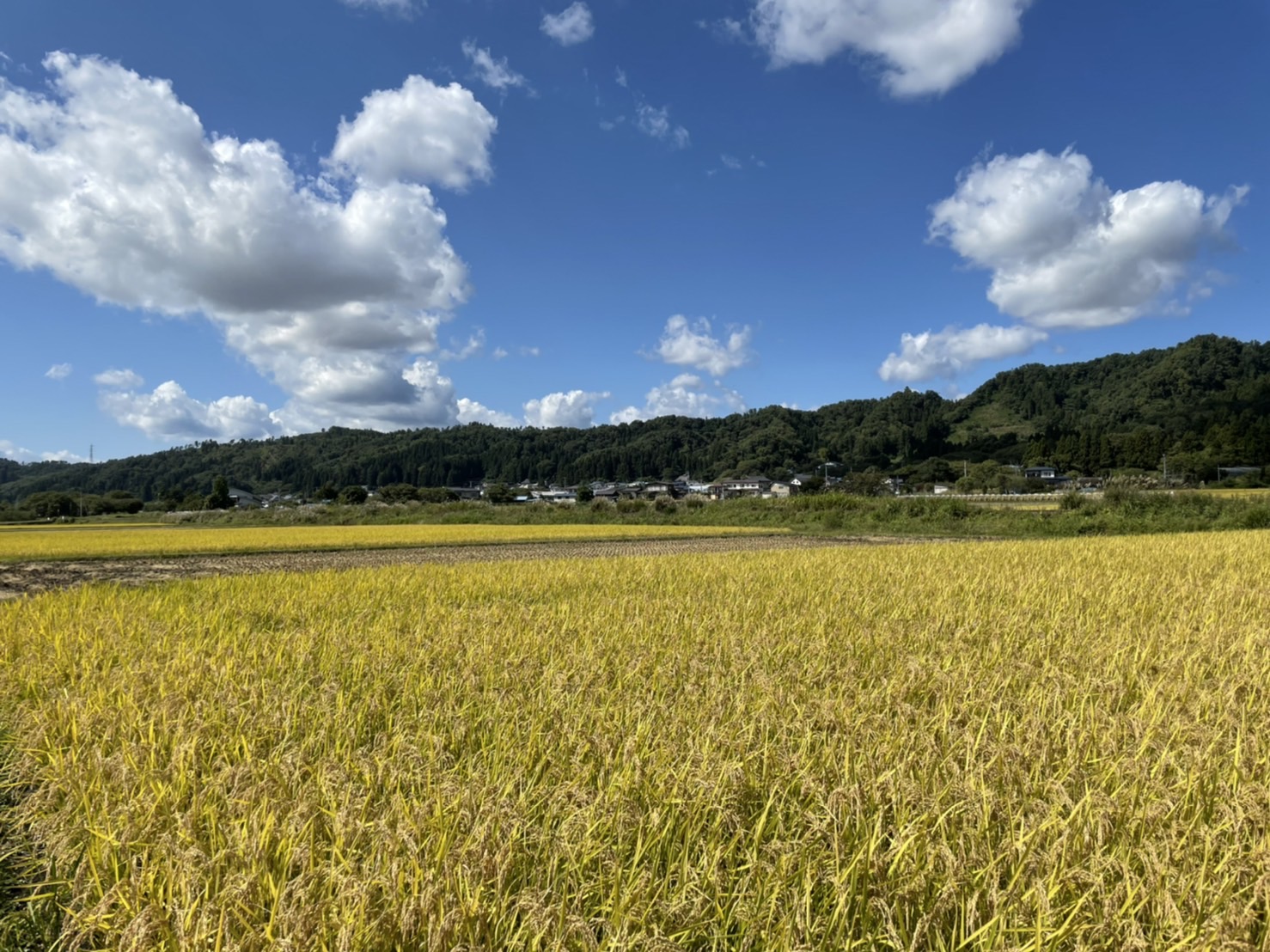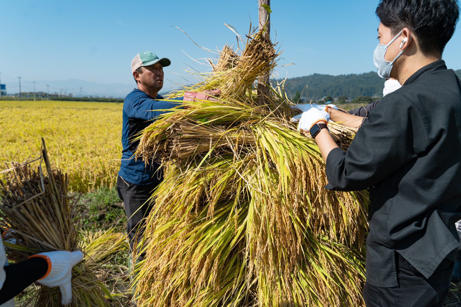 置賜盆地ののどかな風景の中で、立派に実った稲たちを皆さまと一緒に収穫いたします。